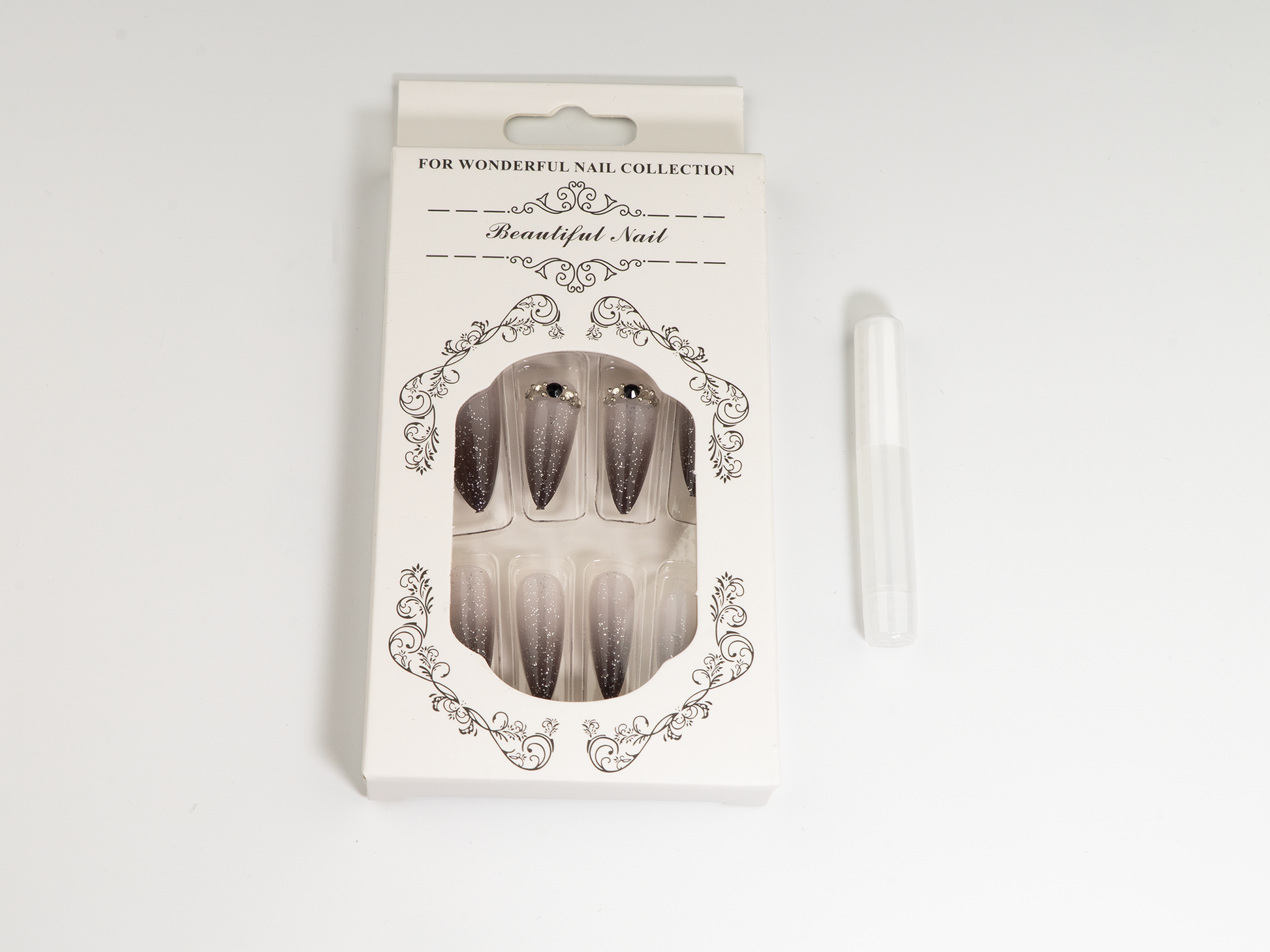 The ultimate feast of luxury. This set uses a classic black and gold palette, presented in a glitter ombré that smoothly transitions from golden stardust at the cuticle to a deep black night at the tip—full of drama and sophistication. Black and white rhinestones at the base, like stars and diamonds in the night sky, make this luxury even more dazzling. The stiletto shape shows off your inner queen.