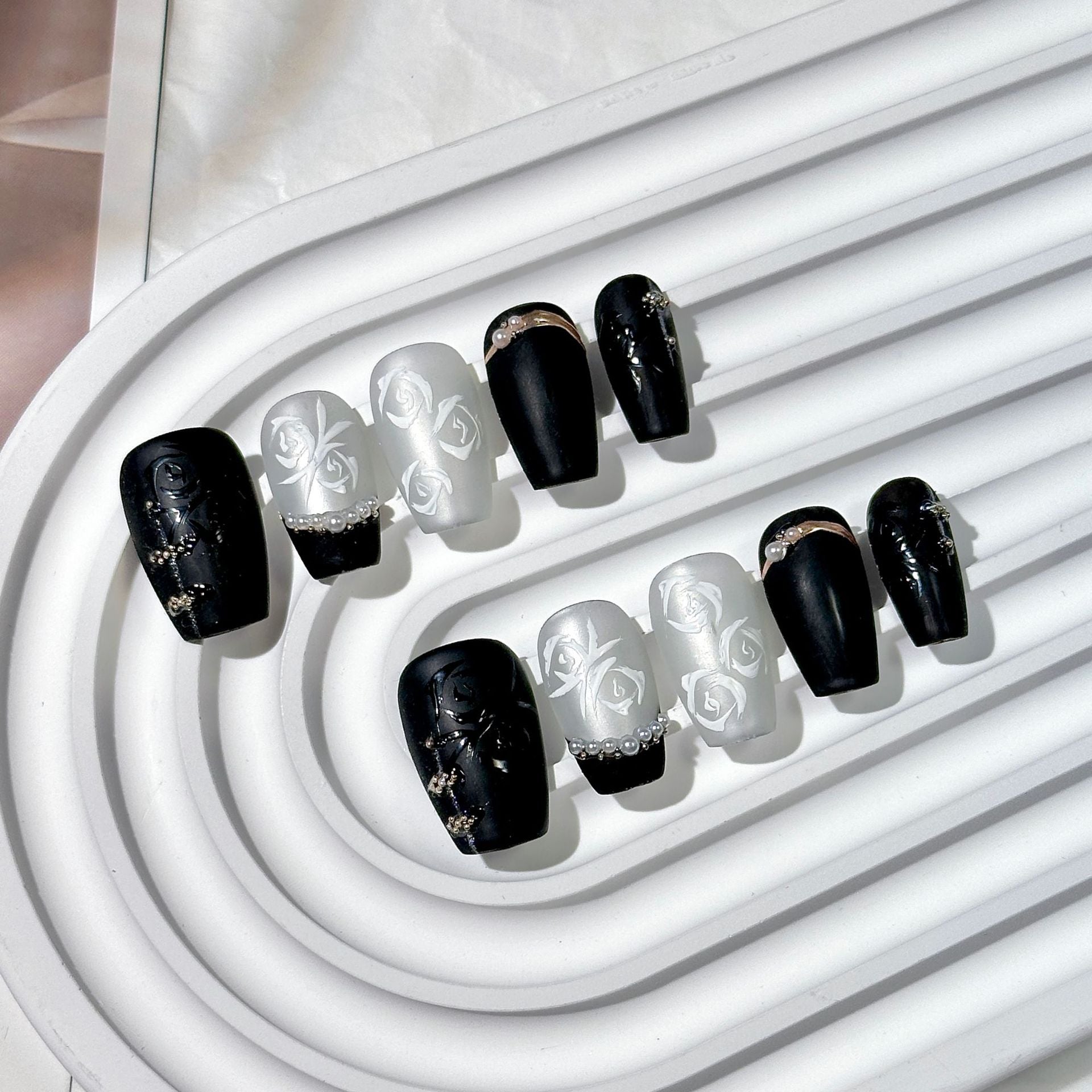 Black silver rose press-on nails, long trapezoid shape, black-silver tone with rose & pearl details, dark luxury, fits parties & dates.