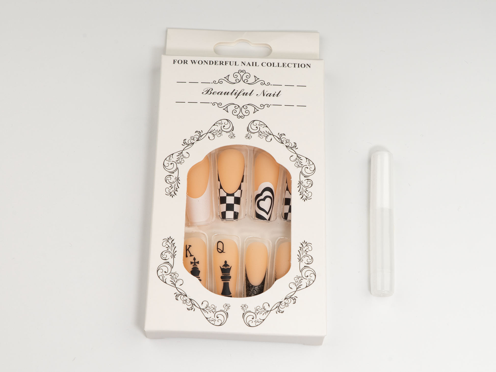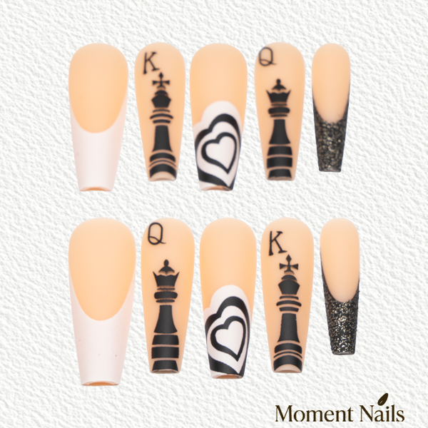 Make your move in style. This chess-inspired press-on set features intricately designed black king and queen pieces over a matte nude base. Paired with classic checkerboard, a hypnotic heart, and a sparkling black sugar French tip, each nail makes a statement. The extra-long ballerina shape gives every gesture an air of command.