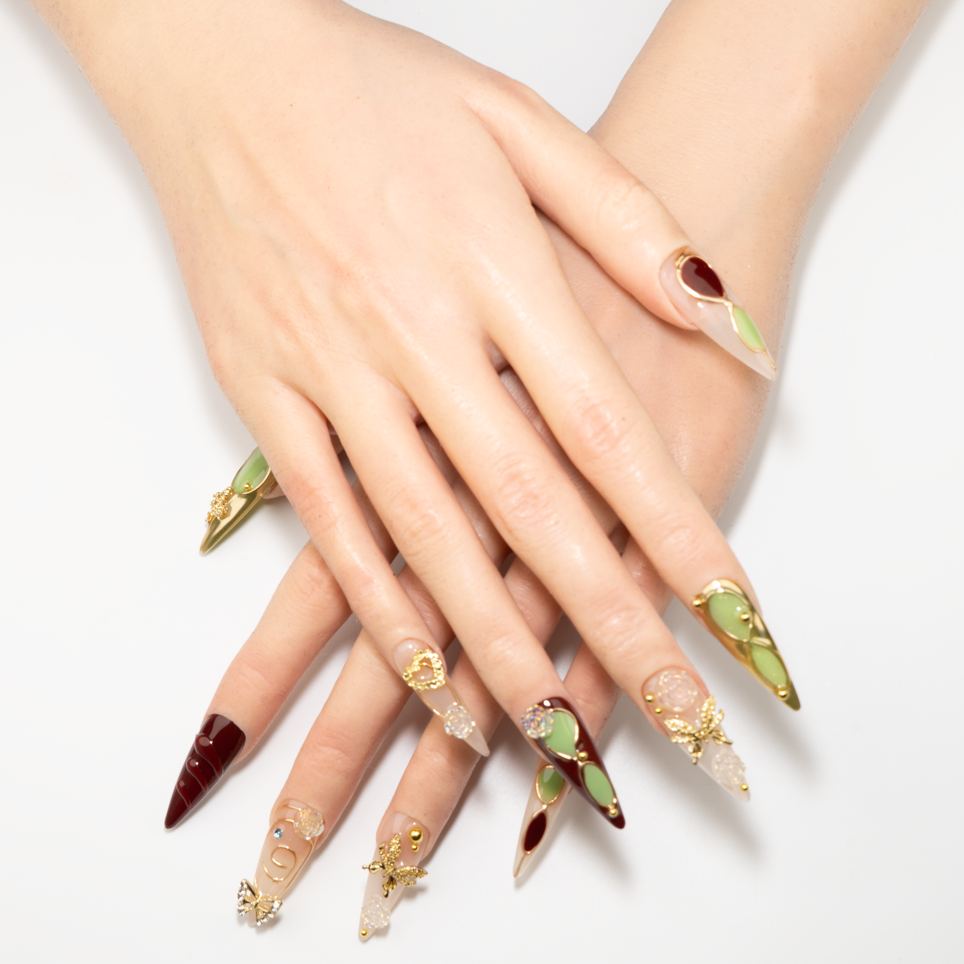 Indulge in vintage luxury with these exquisite Stiletto Press-On Nails. The design features a sophisticated color palette of deep burgundy and sage green, elevated by opulent gold chrome accents.