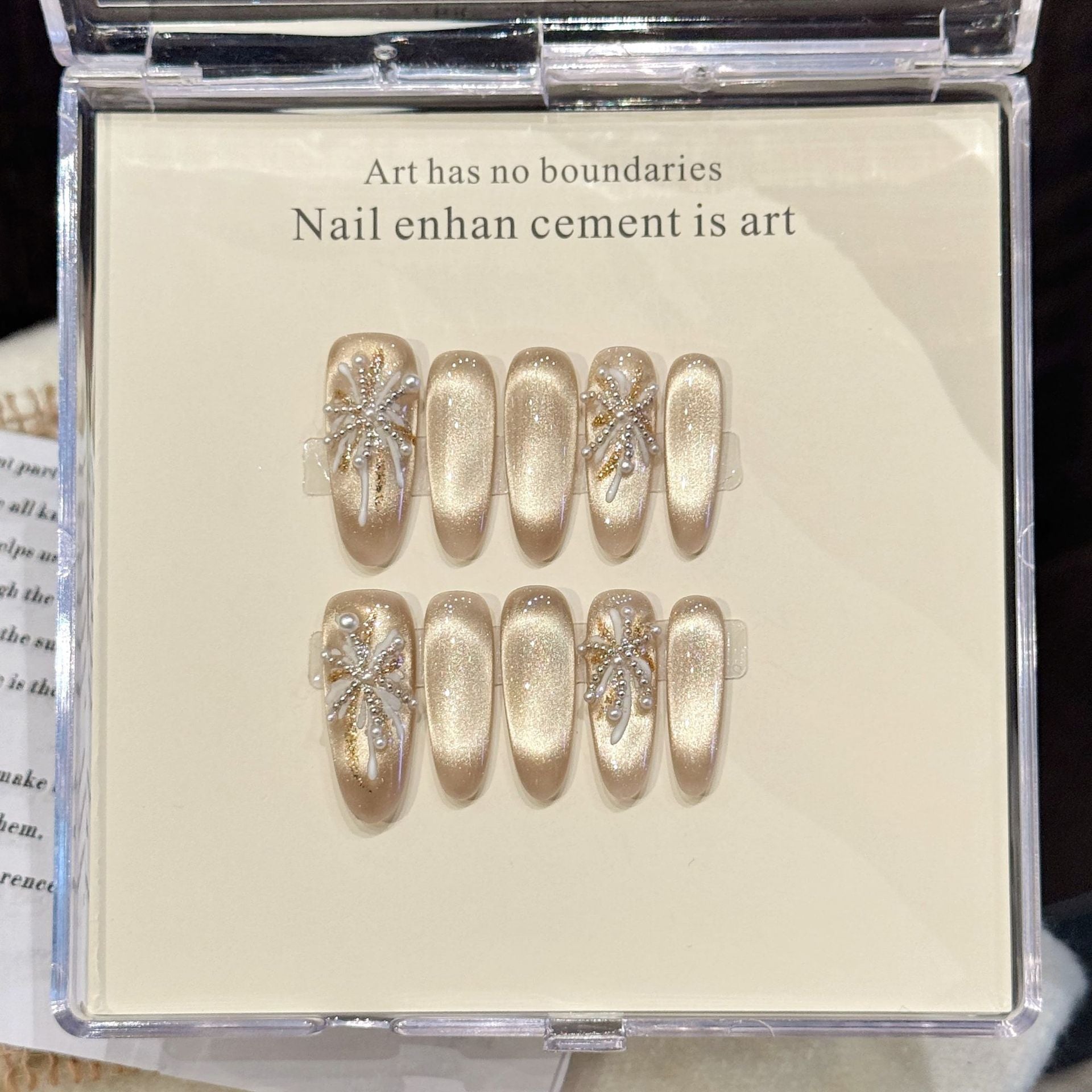Long oval press-on nails, champagne gold gradient base with diamond and pearl decor, luxury shimmer style, suitable for banquets, dates and other elegant occasions.