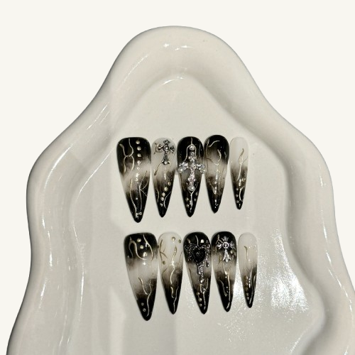 Enter the gothic sanctum with the "Night Relic" press-on nail collection. This design is filled with mysterious religious aesthetics and dark romance. Black and white blend into a smoke-like ombre effect on the nails, reminiscent of incense swirling in a cathedral. The focus is the handmade, 3D vintage cross, adorned with sparkling rhinestones and lustrous pearls, creating a look that is both sacred and opulent. Golden lines and dots flow across some nails like gilded patterns on an ancient bible. The extra-long stiletto shape is impactful and the ultimate gothic statement. These high-quality, handmade press-on nails are reusable, transforming you into a gothic noble of the night.