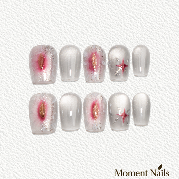 Light up your "Galactic Beacon" in the vast universe. This press-on set is filled with futuristic sci-fi colors. The flowing silver cat-eye is the endless interstellar space, while the red energy cluster in the center is the signal from the beacon, shining with a dangerous yet alluring light. The eye-catching red four-pointed star, like a compass on a star map, points the way. Irregular silver glitter flakes are the stardust encountered during the voyage. The short coffin shape is simple and full of tech-savvy. These high-quality, reusable nails are designed for those who love sci-fi and exploring the unknown.