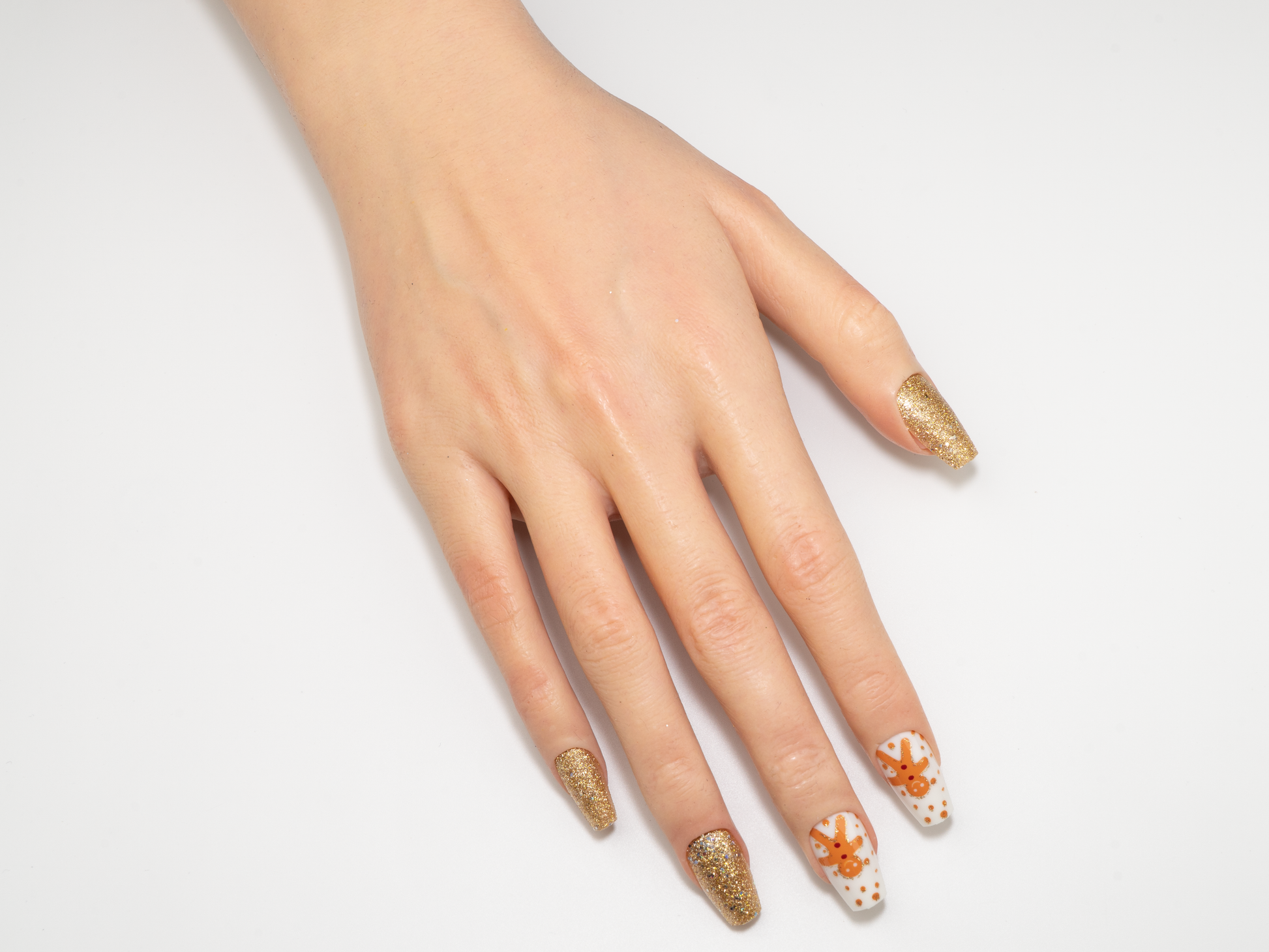 A design, full of sweet holiday spirit. This set is inspired by Christmas gingerbread houses and desserts, featuring a warm caramel-colored "syrup" drip with colorful "sprinkles." Accent nails are hand-painted with a cute reindeer and candy canes, paired with full-coverage, diamond-like gold glitter nails. The overall style is sweet, glamorous, and playful. The long coffin shape makes this festive joy feel even more chic.