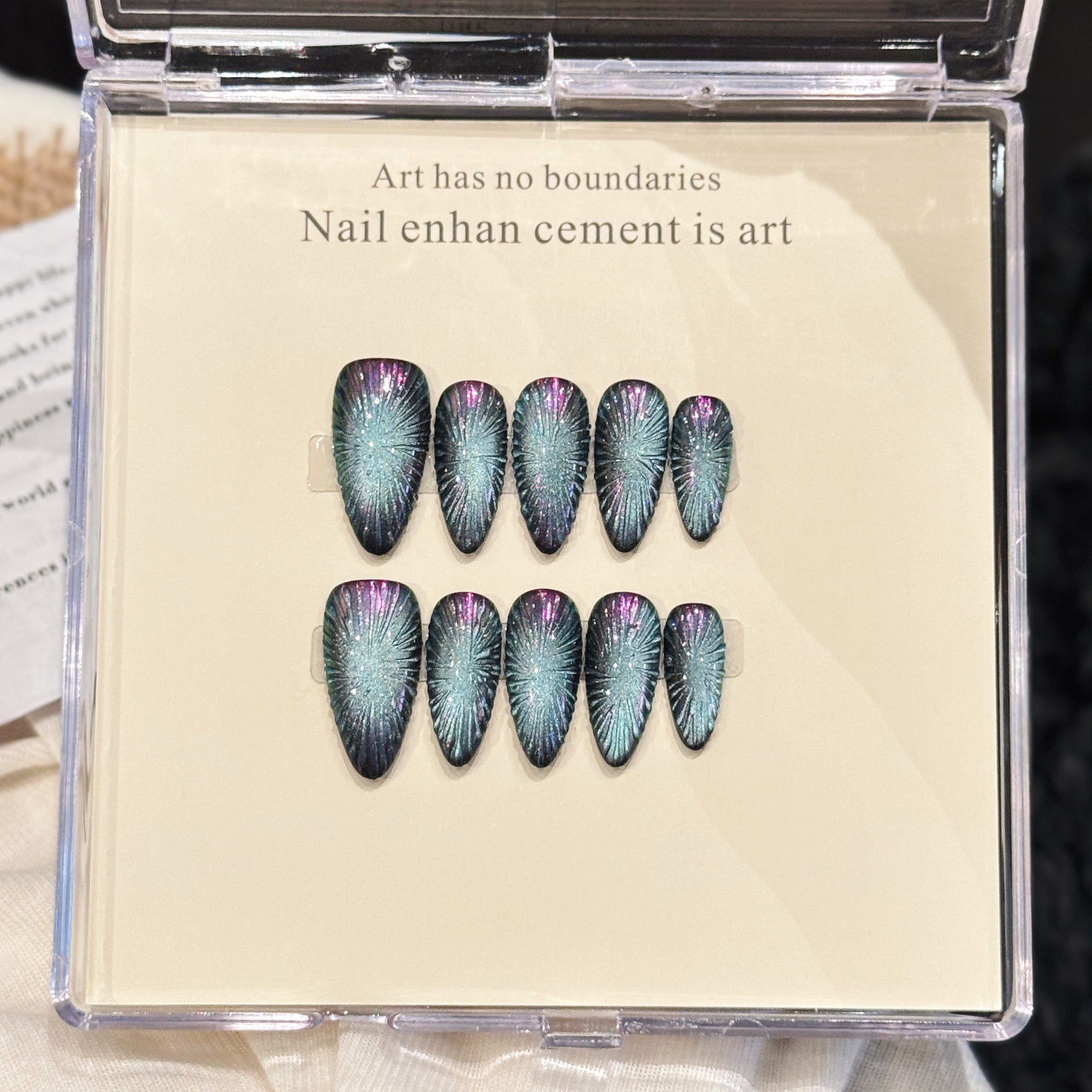 Long-length stiletto press-on nails with iridescent blue-green & purple firework patterns, featuring sleek, futuristic cool style.