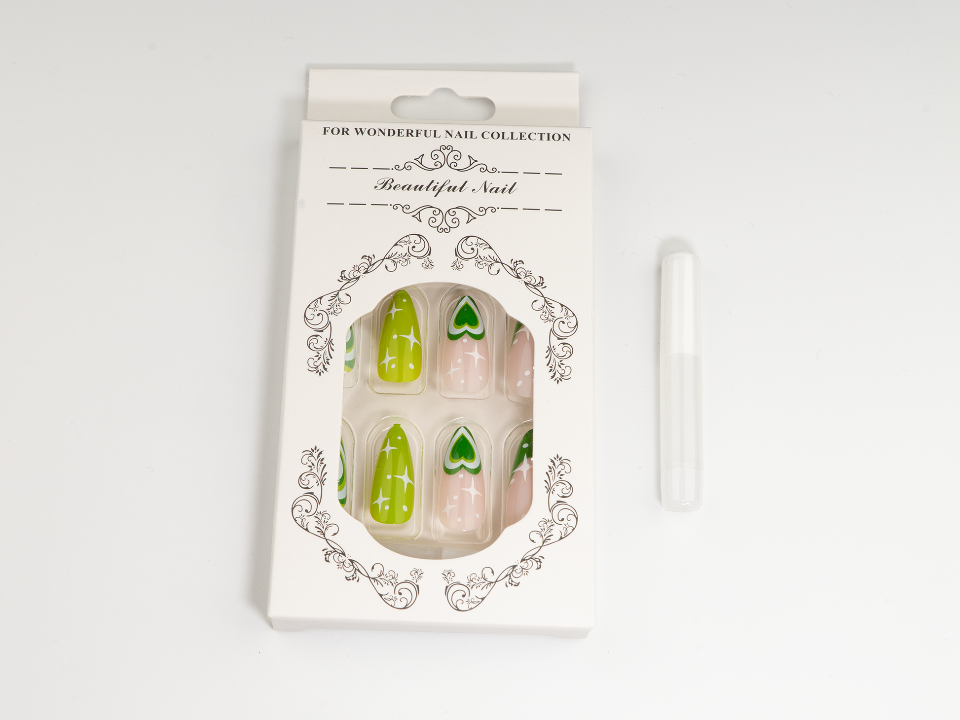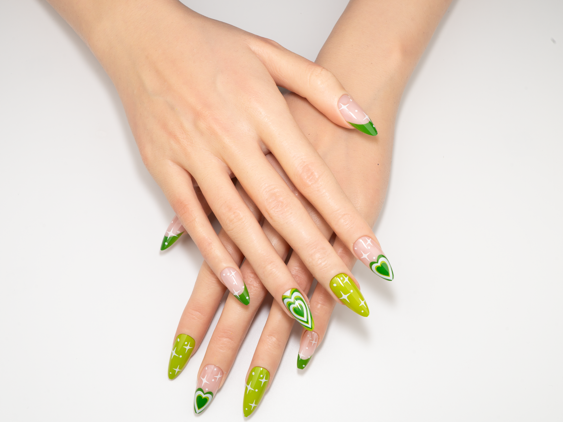 Layered Heart Press-On Nails | Green Latte Art & Stars | Stiletto