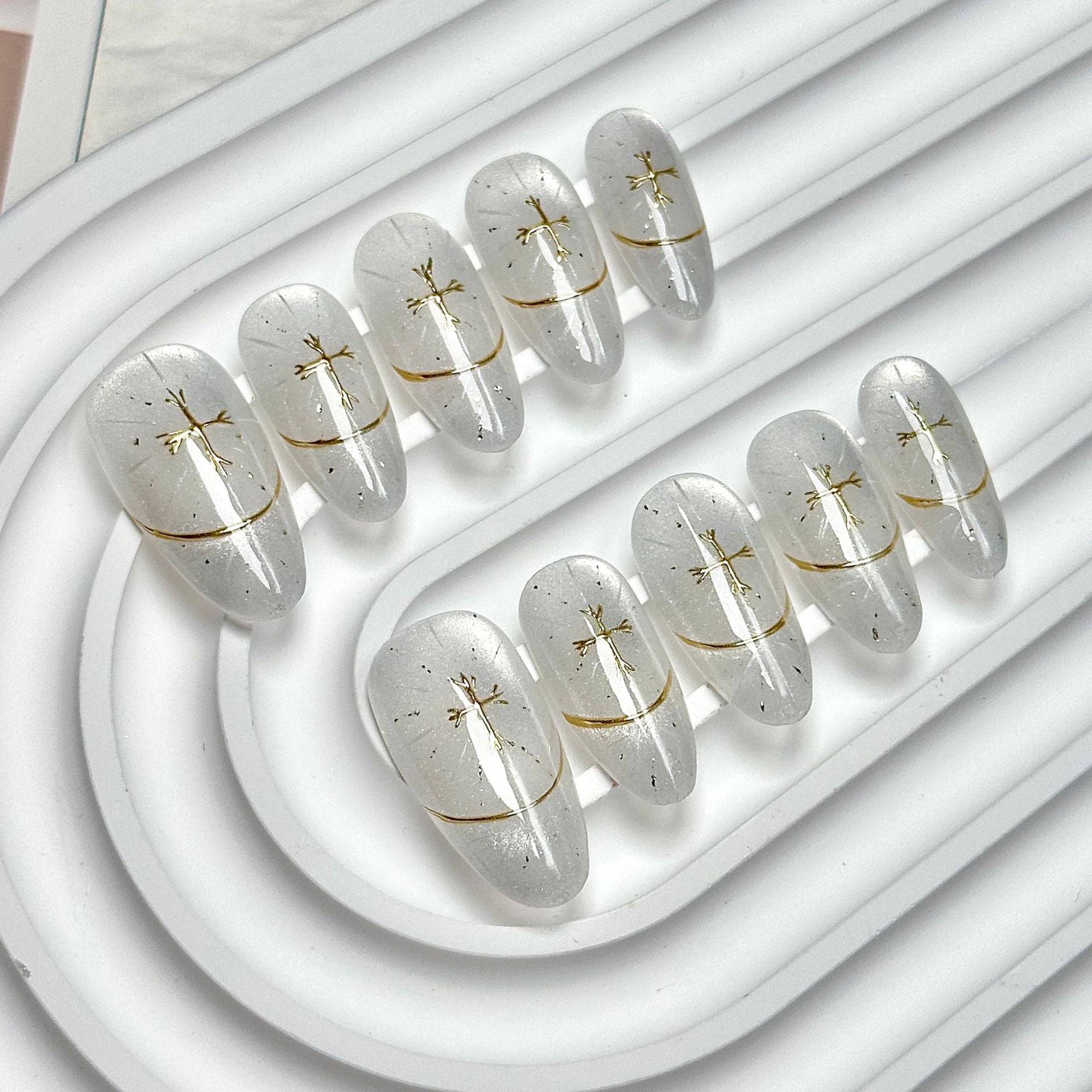 Medium-length oval press-on nails, with clear glitter base and gold accents, minimalist luxury style, suitable for daily commutes and mature casual outfits.