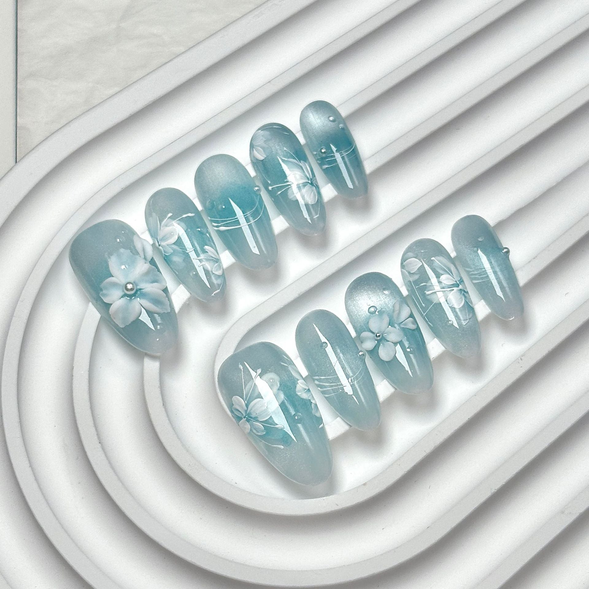 Medium oval press-on nails with light blue gradient base, decorated with 3D flowers & tiny studs. Fresh gentle style, easy to apply.