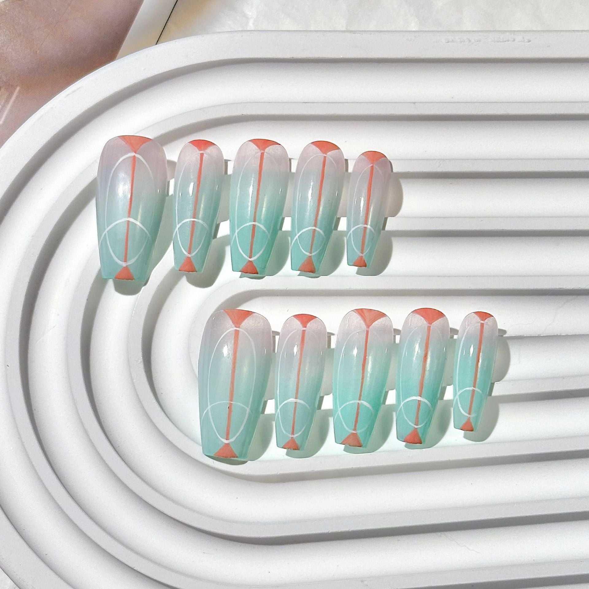 Light green geometric press-on nails, long trapezoid shape, light green gradient with geometric lines & orange-red accents, minimalist and fresh, fits commutes & daily mature-casual occasions.