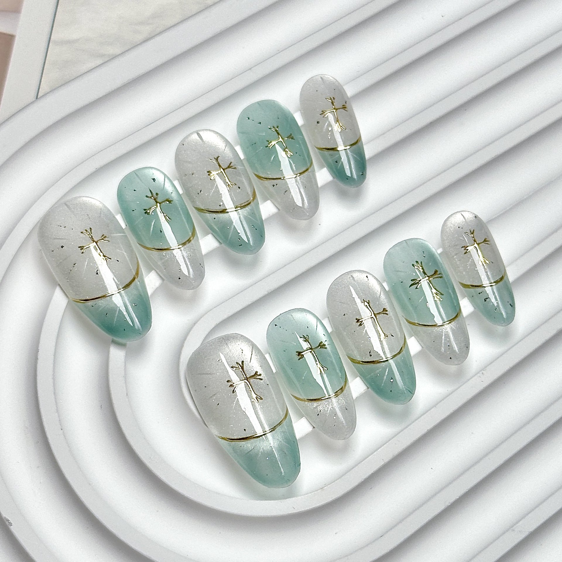Medium-length oval press-on nails, with light green-white gradient base and gold accents, fresh luxury style, suitable for daily commutes and light fashion scenes.