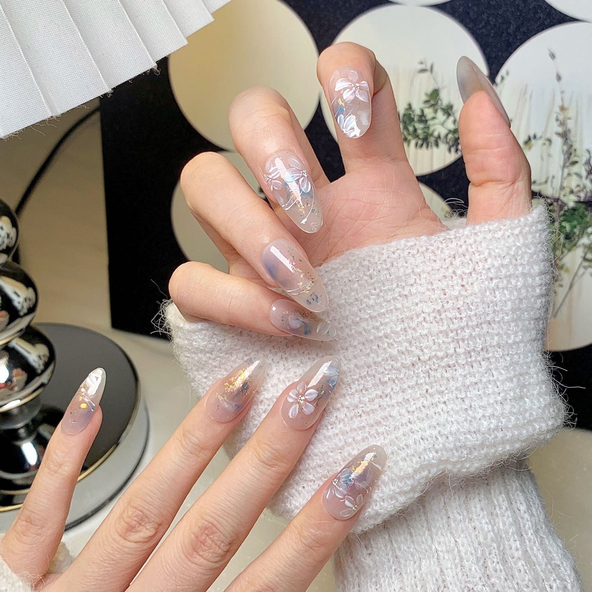 This press-on nail features a light milk tea translucent base, decorated with gradient gold glitter, white flowers and blue-green details. Medium-long almond shape, transparent light luxury and exquisite, fits daily/commute outfits, easy to apply.