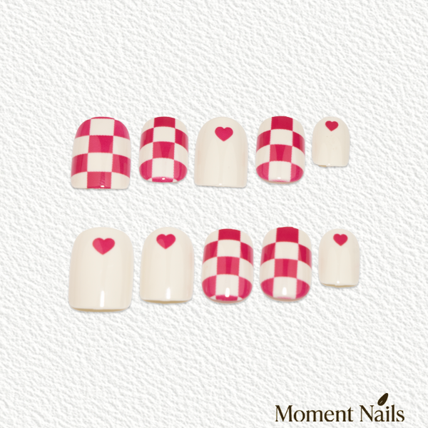 Brighten your fingertips with a "Love Mood." This design perfectly captures the sweetness and thrill of being in love. The gentle creamy yellow is the base tone of love, while the passionate hot pink is the throbbing heartbeat. The designer presents these two colors in the form of little hearts and a checkerboard, full of sweet symbols of love. This is a design that can instantly make you feel happy. The short oval shape is cute and charming. Let your fingertips tell a romantic story.
