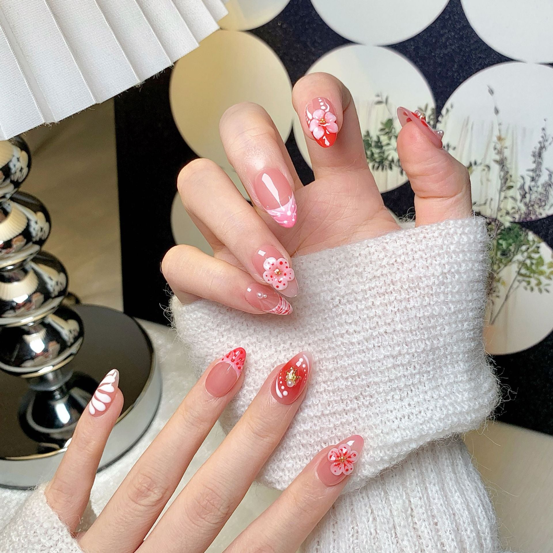 Pink cherry-style almond short press-on nails, adorned with flowers and pearl studs, featuring pink-white gradient & translucent texture, gentle and delicate.