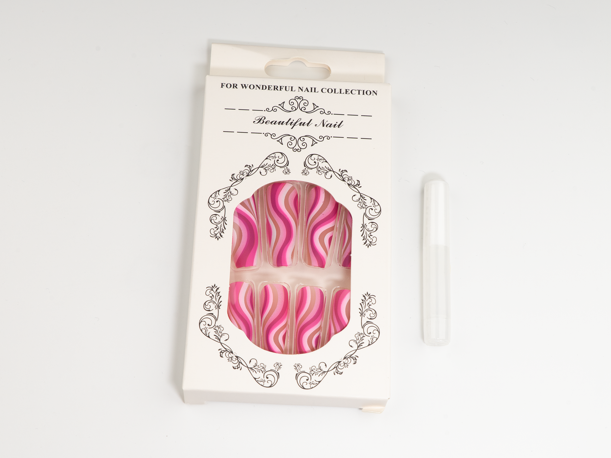 Feel the visual rhythm of our "Pink Groove" press-on nails. This set features fluid, curved lines where various shades of pink and white intersect, creating a sense of dynamic movement on long ballerina-shaped nails. The matte finish enhances its modern and artistic appeal. It's the perfect fusion of personality and fashion for anyone seeking a bold, avant-garde style. These high-quality nails are reusable, keeping your fingertips full of energy.