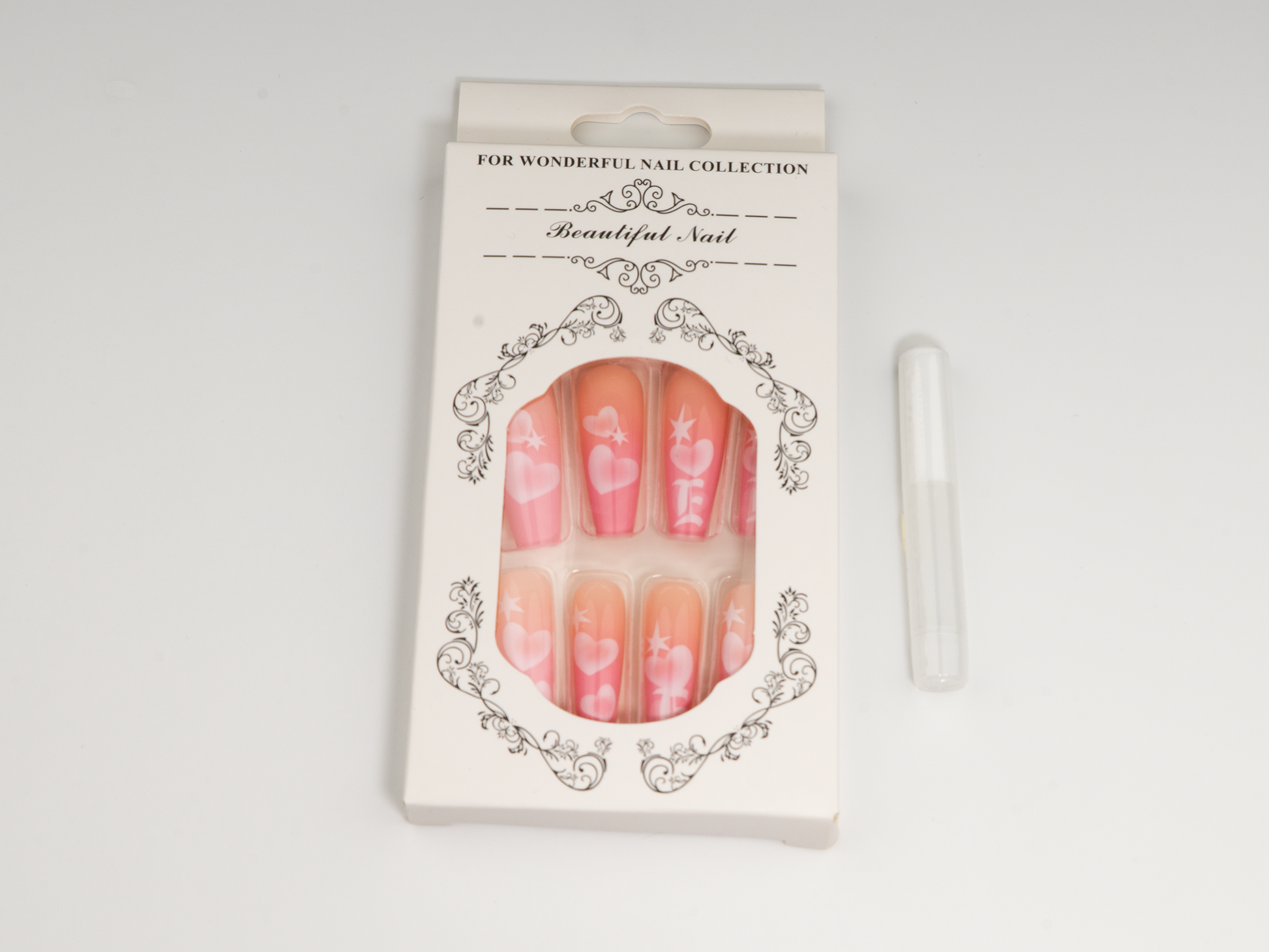 The perfect collision of sweet and powerful—the "Sweet Baddie" press-on nails. This set is designed for those who are both sweet and fierce. On a gentle nude-to-pink ombre, cloud-like white hearts float, exuding endless sweetness. However, the bold gothic initial and shining starbursts instantly inject a powerful baddie vibe into this sweetness. The Ballerina shape takes this contradictory yet charming style to the extreme.