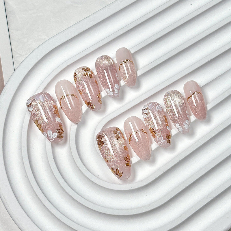 Medium-length oval press-on nails, with pink sheer base decorated with gold accents and white floral details, gentle light luxury style, delicate and transparent texture, suitable for daily sweet-elegant looks.
