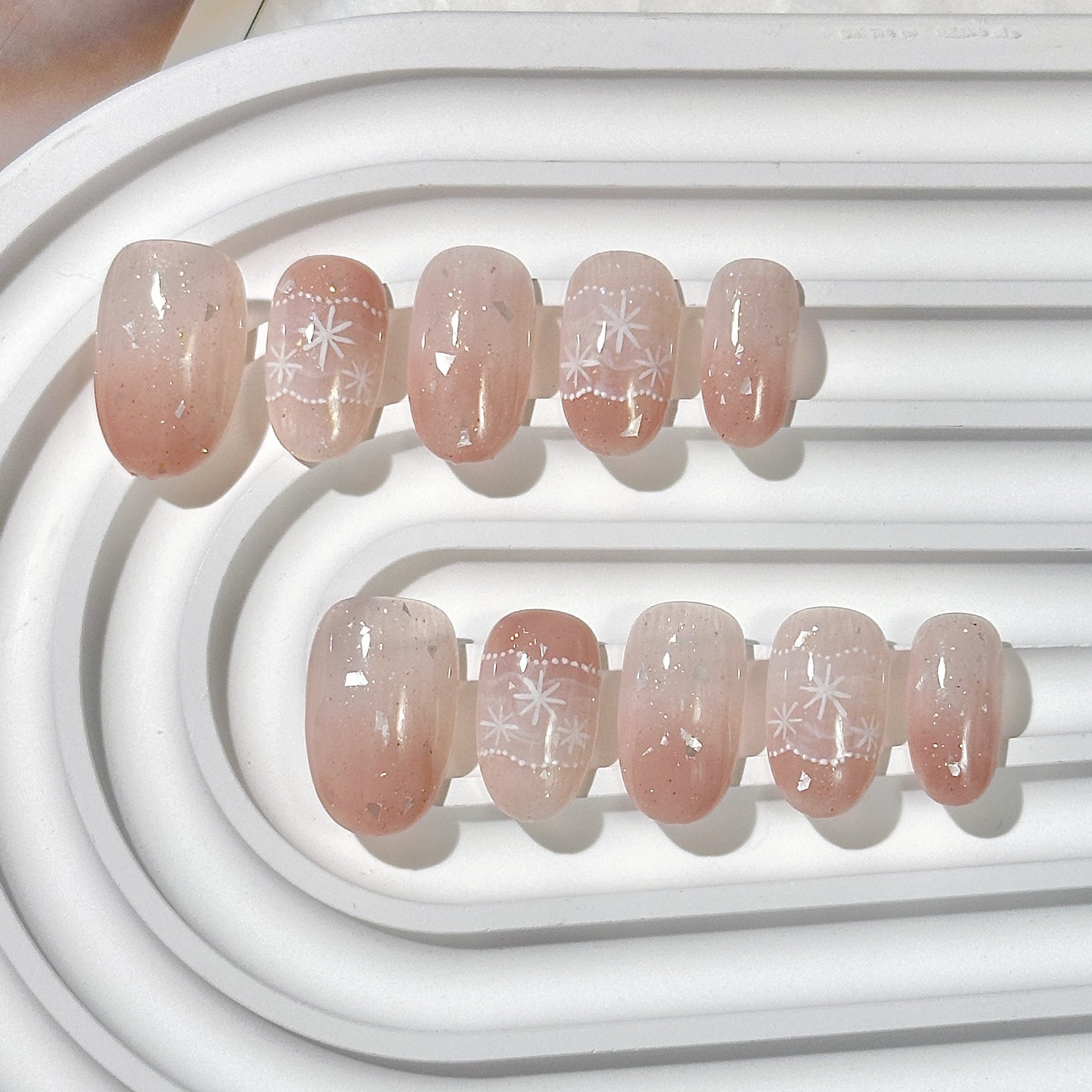 Short oval press-on nails, with pink sheer glitter base decorated with hand-painted snowflakes, gentle sweet style, transparent and delicate texture, suitable for daily casual & light-sweet looks.