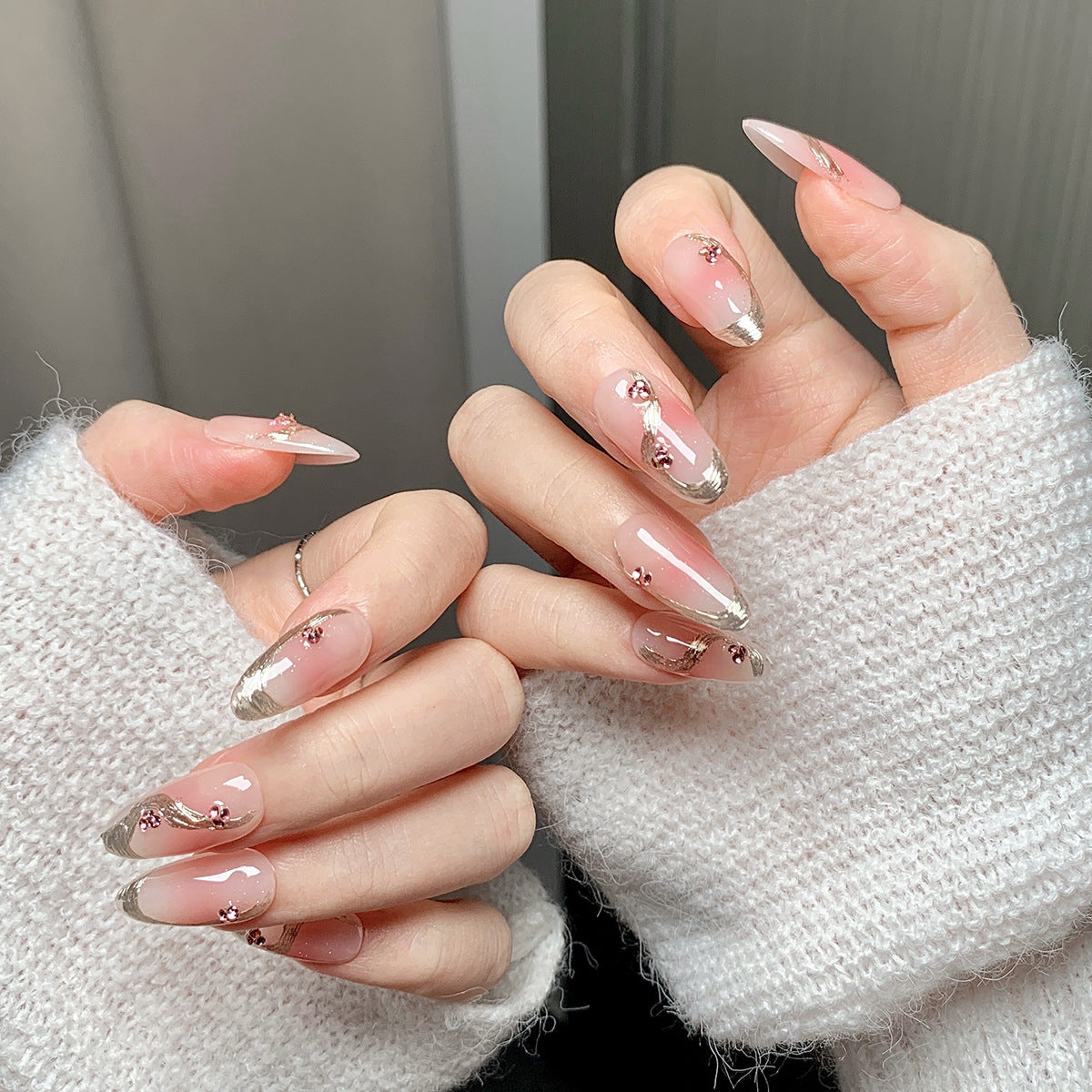 Medium-length almond press-on nails, with pink translucent base paired with gold wire wrapping and diamond accents, featuring elegant luxury texture, delicate and temperamental, suitable for daily, dates and more.
