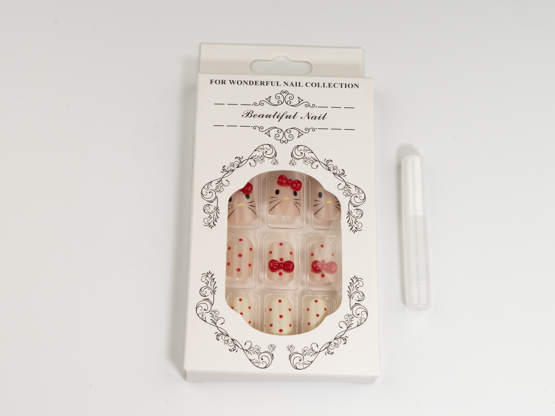 This cute press-on nail set is characterized by its playful mixed design. The accent nail, on a sheer glitter base, features a 3D red bow and hand-painted cat whiskers. The set also includes solid bright red, a cream base with red polka dots, and a glitter nail with red polka dots for a variety of designs. The short square shape is beautiful and chic for everyday wear.