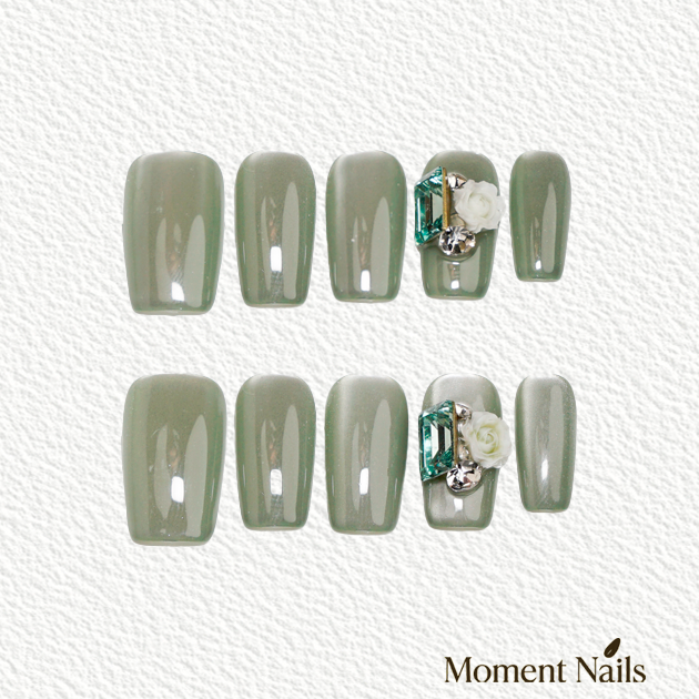 The highlight of this press-on nail set is its exquisite 3D embellishment. On the accent nail, a handmade white rose is lifelike, next to a statement-making light blue, square-cut gemstone, all accented with rhinestones at the base for a rich, layered look. The remaining nails feature a light green polish with magnetic glitter, creating a bright cat-eye band. The mid-length and square shape are both trendy and classic. These high-quality, reusable nails allow you to showcase your charm with every gesture.