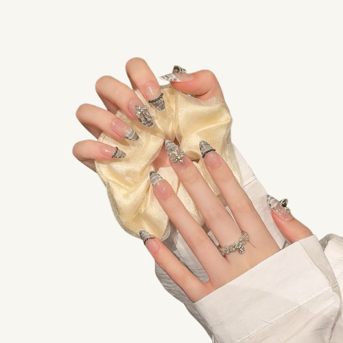 A fatal temptation from the Garden of Eden—the "White Serpent's Heir" collection. This set presents the element of the snake in a cool, high-fashion way. The grey texture on the tips is like the shed skin of a white serpent, full of mysterious allure. The cross, encrusted with pearls and rhinestones, symbolizes the guarded forbidden fruit. The black beads on the smile line are like tiny snakes coiling around your fingertips. These high-quality, handmade press-on nails are reusable, giving you the fatal and elegant temperament of a femme fatale.