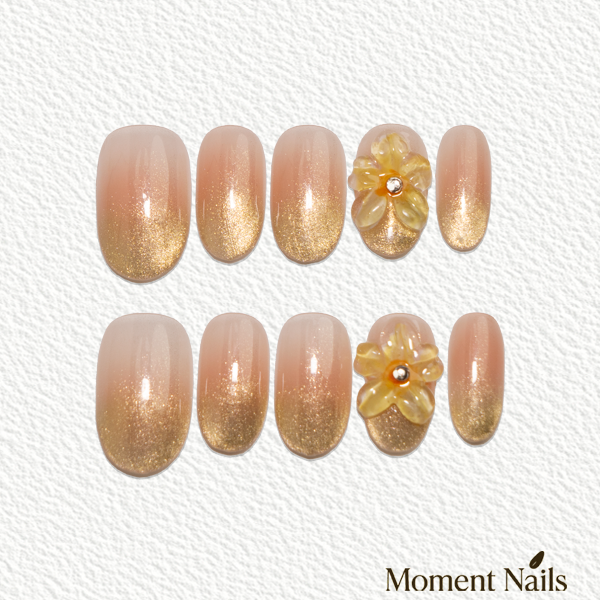 Bloom an everlasting "Summer Glass Flower" on your fingertips. This set is full of summer's gentleness and romance. The tips feature brilliant gold sugar glitter, softly transitioning upwards to a translucent peach nude, like champagne bubbles in the sun. On the accent nail, a hand-carved 3D glass flower blooms quietly, its center adorned with a sparkling rhinestone—crystal clear and full of ethereal charm. The design is delicate and versatile. These high-quality, reusable nails will keep your fingertips full of poetry.