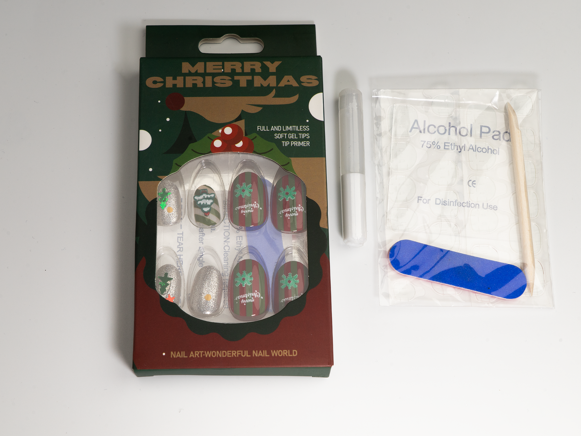 Celebrate the season with nails featuring "Merry Christmas" text, snowflakes, and festive patterns. This squoval-shaped set is easy to apply at home.
