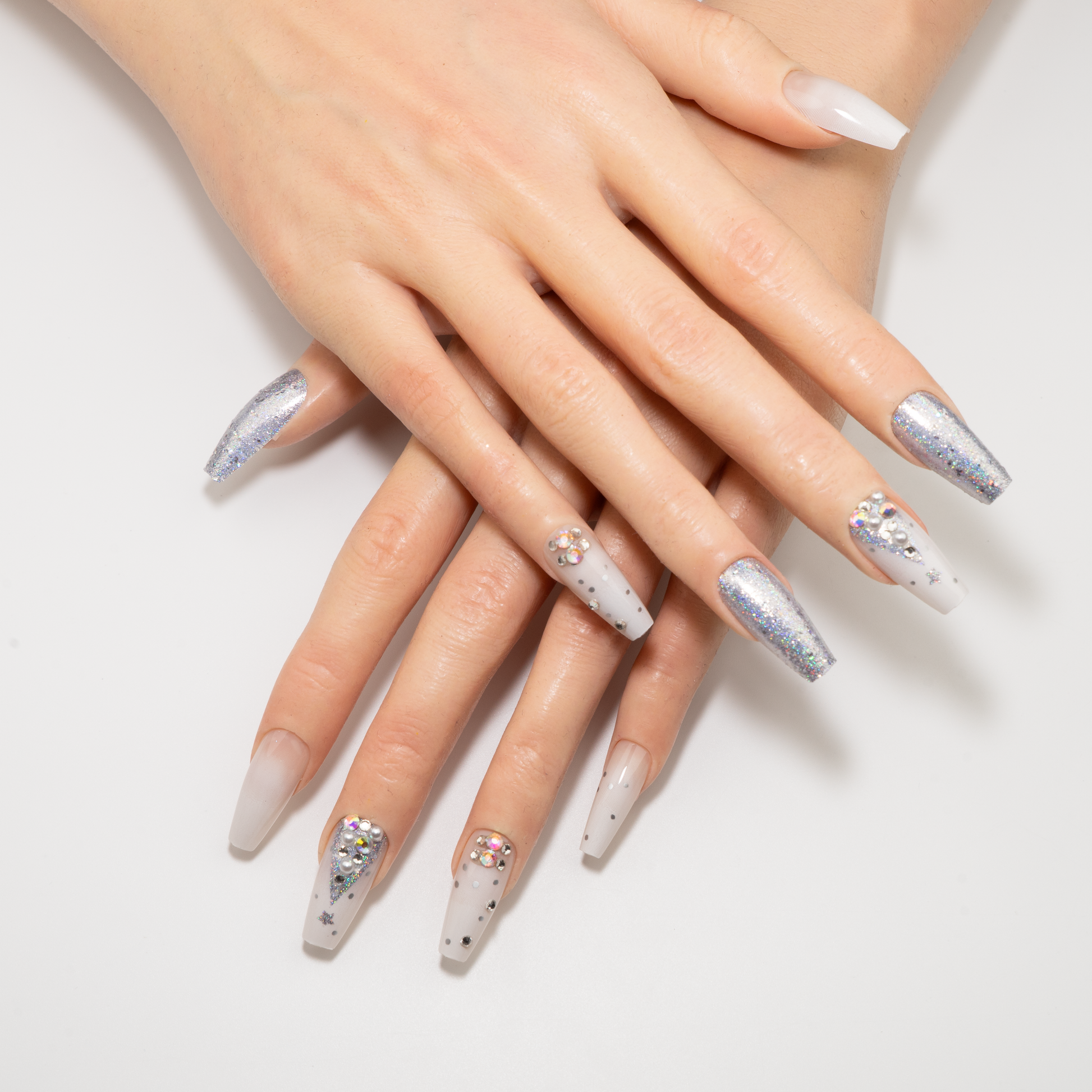 Step into a silver-clad winter wonderland. This press-on set features a pure milky-white base, reminiscent of fresh snow. On the accent nail, a gorgeous Christmas tree is meticulously outlined with sparkling silver glitter, pearls, and rhinestones. Other nails are adorned with brilliant galaxy glitter or snowflake-like scattered gems, full of festive magic and romance.